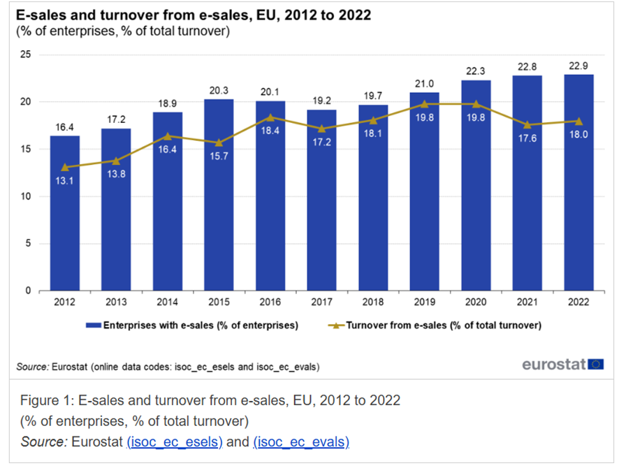 The ecommerce market, as the graph below shows, maintains a growing trend in terms of the percentage of companies in the European Union that offer their services or products via the Internet, reaching 23% of companies offering their products online and 18% of the market's sales volume via the Internet by 2022.